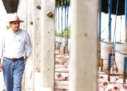 Na suinocultura, a Fazenda possui um plantel de mais de 6 mil matrizes em reprodução, acasaladas e dentro de um rígido programa de avaliação genética, dando origem a animais de alta performance, com potencial de carcaça e carne magra, que atende aos mais altos padrões de exigências do mercado nacional e internacional.